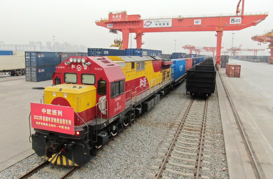 Der China-Europa-Güterzug, beladen mit 1.300 Tonnen Mehl aus Kasachstan, bei der Ankunft am internationalen Bahnhof Xi'an am 13. Januar 2023. (Foto von Li Yibo /Xinhua)