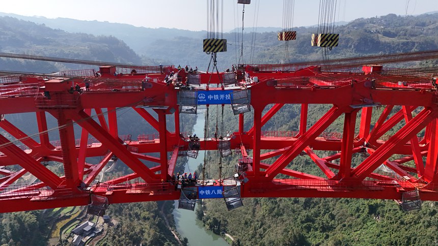 Der Stahlbogen der Fenglai-Daxi-Brücke auf der Schnellstraße zwischen Wulong und der Liangjiang New Area in Chongqing wurde erfolgreich verbunden. (Foto: Li Changlun/People's Daily Online)