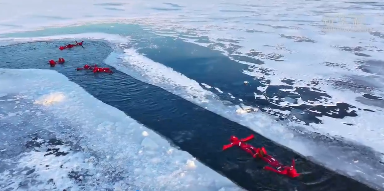Im neu eröffneten Eisschwimmclub in Altay schwimmen Besucher in isolierten, wasserdichten Neoprenanzügen ruhig auf der Oberfläche des eiskalten Wassers und genießen den Nervenkitzel dieses Sports. (Screenshot aus einem Video von Xinhua)