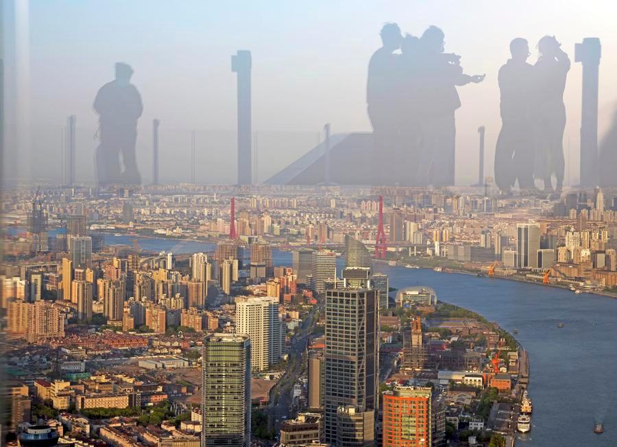 Besucher spiegeln sich an einem Fenster von The Stage, einer neuen Aussichtsplattform auf dem Dach des White Magnolia Plaza in Shanghai, am 14. April 2025. (Foto: Xinhua/Liu Ying)