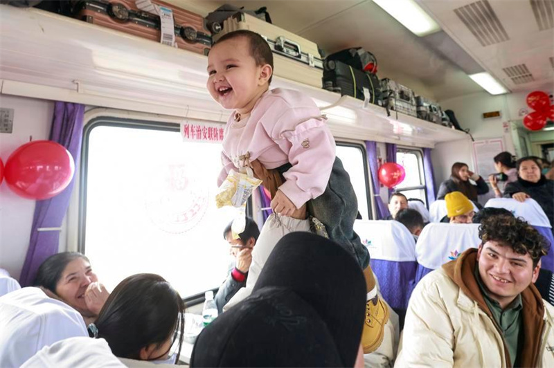 Ein Fahrgast spielt am 2. Januar 2025 mit einem Kind im Zug Nr. 7557 von Urumqi nach Hotan, Präfektur in der nordwestchinesischen Uigurischen Autonomen Region Xinjiang. (Xinhua/Wang Fei)