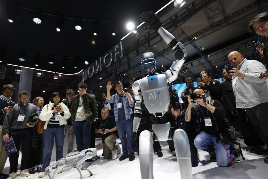 Besucher bei der Vorführung eines humanoiden Roboters und eines Roboterhundes am Stand von Honor auf dem World Mobile Congress 2025 in Barcelona (Spanien). 3. März 2025. (Foto: Xinhua/Zhao Dingzhe)