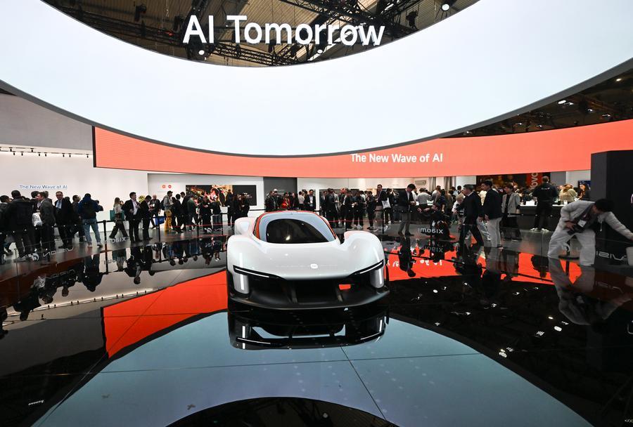 Besucher betrachten ein Fahrzeug, das am Stand von Xiaomi während des Mobile World Congress (MWC) 2026 in Barcelona, Spanien, am 2. März 2026 ausgestellt ist. (Xinhua/Cheng Min)